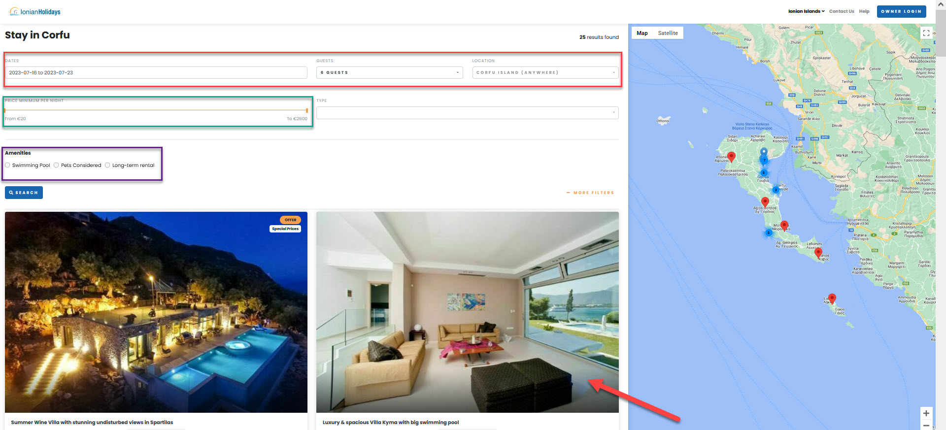 B) Once you retrieve the results, you can change the dates and search again (1), you can adjust the desired price (2), or you can refine the results with some criteria (3). You can click anywhere on the property to see more details for each property.